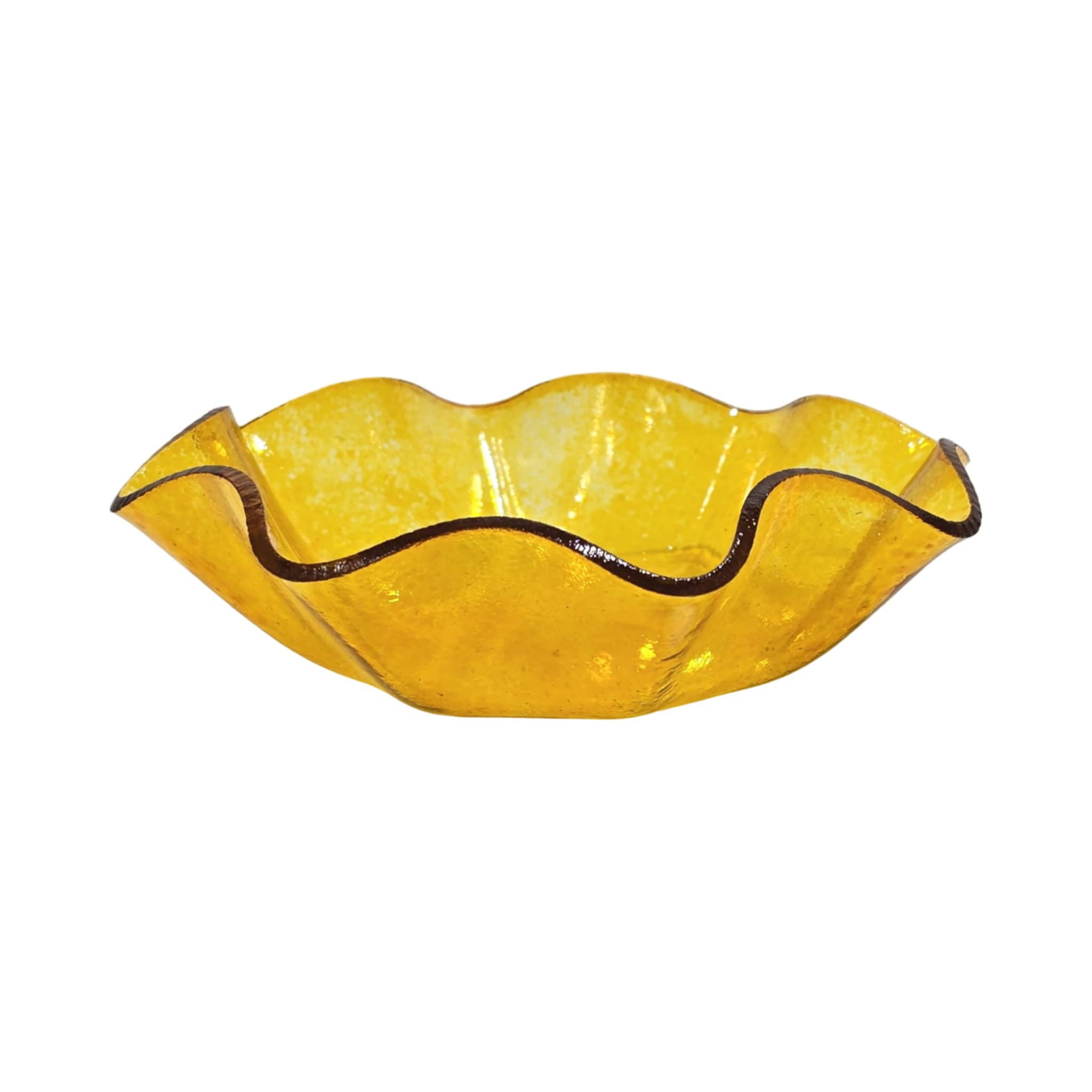 Handcrafted in a brilliant yellow and edged in a soft dark rim, it has a graceful ruffled shape that invites both touch and admiration.